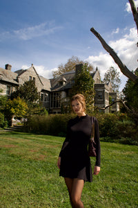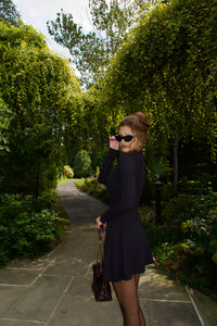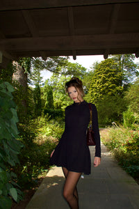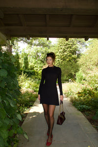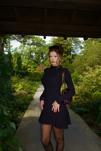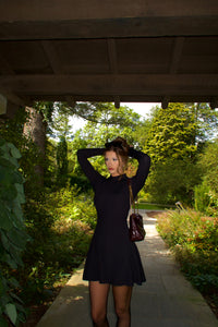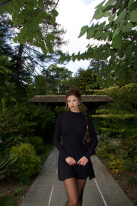 Chic, elevated basic black ribbed athleisure, high neckline long sleeve mini dress. The flared A-line cut of this dress enhances a hourglass body shape, hugging at the waist and flaring at the hips. Jane is the go-to dress for any occasion dressed up or down. The mock neck provides a touch of sophistication while the A-line cut flows gracefully over your hips. Dress it up with stockings and heels for a night out or wear it casually with sneakers for daytime chic.